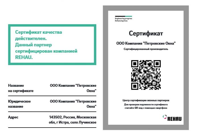 Качество выпускаемых изделий соответствует требованиям бренда - проверено и подтверждено документально. Оконные конструкции периодически проходят испытания в техническом центре REHAU, на соответствие с качеством ГОСТ 23166-99 / 30674-99.